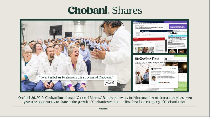 L’imprenditore Hamdi Ulukaya, immigrato curdo negli Stati Uniti, fondò Chobani partendo da zero: oggi ha donato ai suoi dipendenti quote aziendali del valore di 150 mila dollari, ha creato un programma di “parental leave” retribuito, ha lanciato un programma di Incubator, una Fondazione con l’obiettivo di rafforzare le comunità, migliorare l’alimentazione e il benessere dell’infanzia e aiutare chi è nel bisogno.