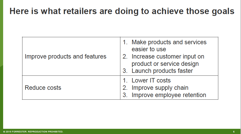 Migliorare prodotti e funzionalità: i retailer renderanno i prodotti più facili da usare, lanciano i prodotti più velocemente e aumentano l’input dei clienti durante la progettazione dei prodotti.