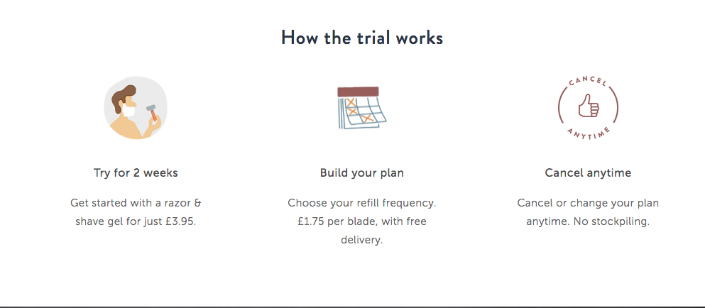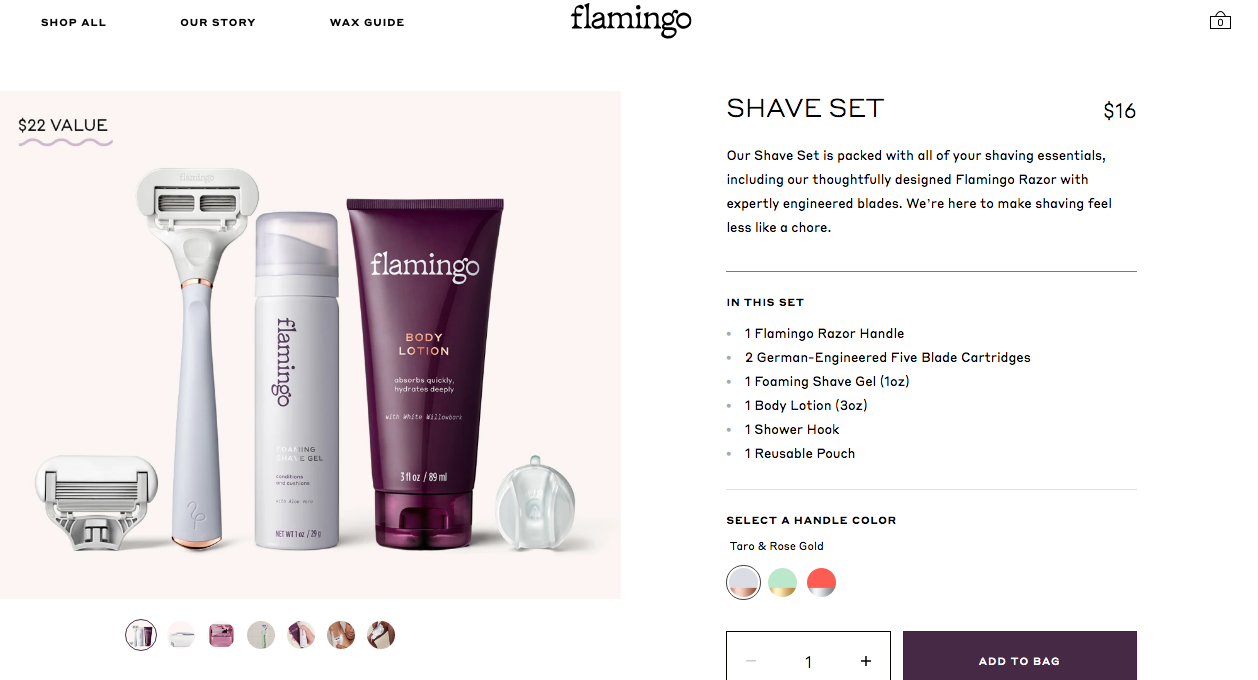 Flamingo offre set da barba pratici e snelli per le donne a prezzi accessibili. I set includono un rasoio, due cartucce a lame rimovibili, un gel da barba schiumogeno, una lozione per il corpo, un supporto per rasoio di aspirazione che si attaccherà alla parete della doccia e una borsa da viaggio. Il marchio offre anche due kit ceretta, uno per il viso e uno per il corpo, ciascuno dei quali viene fornito con strisce di cera, panni post-cera e un siero calmante. Il messaggio scherzoso di Flamingo e le istruzioni scanzonate sulla rimozione dei peli, il design sofisticato e il packaging (rigorosamente senza rosa) e il branding senza fronzoli hanno lo scopo di conquistare i consumatori che potrebbero o meno avere familiarità con il marchio di Harry.