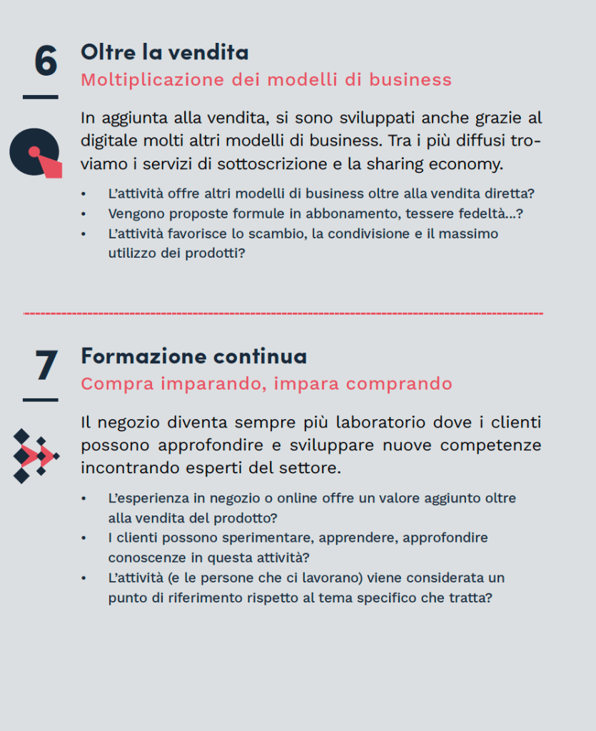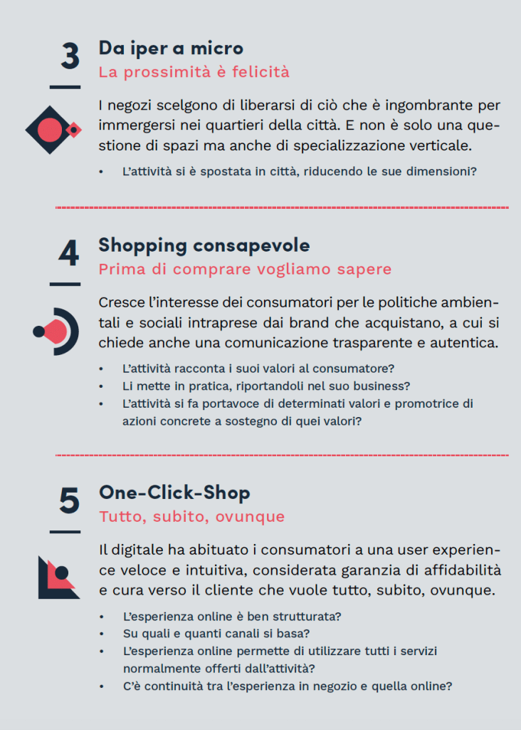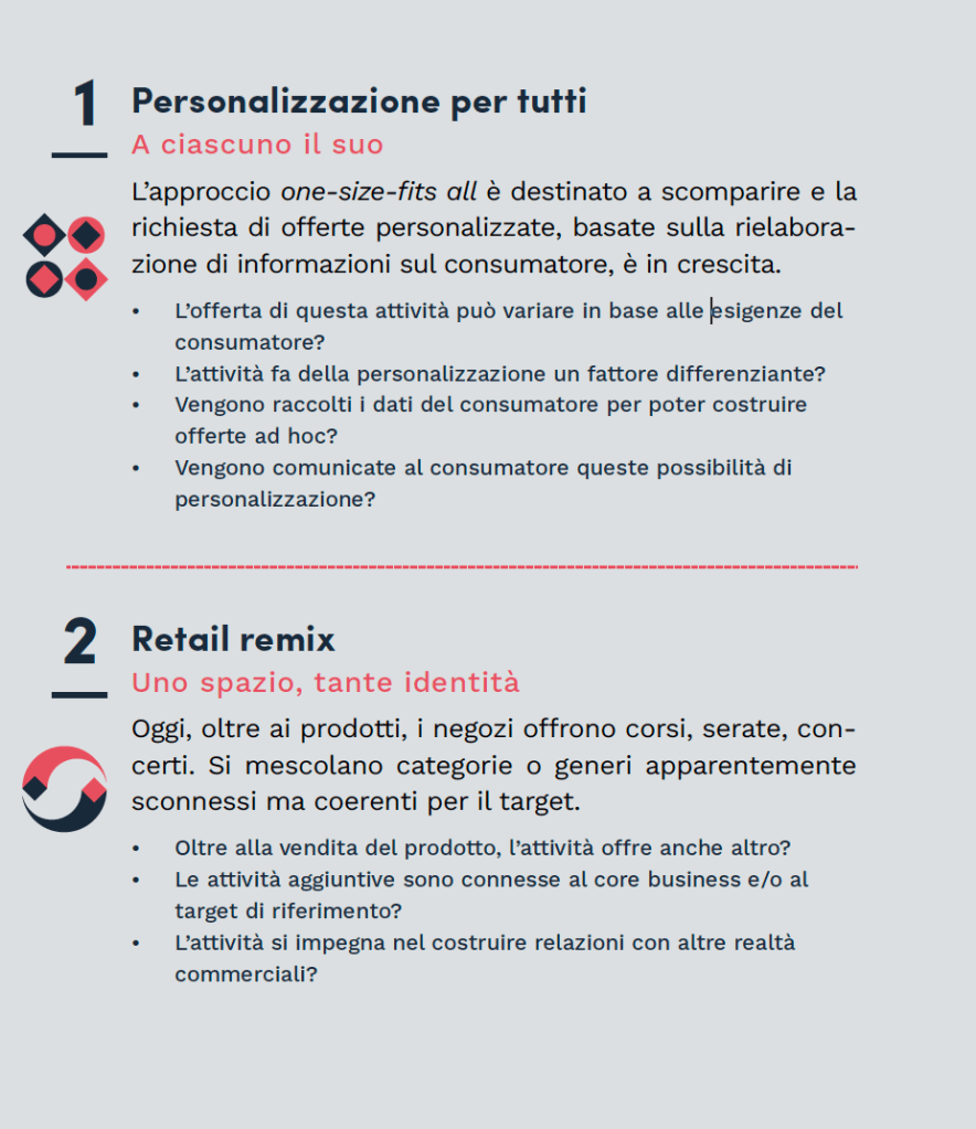 “Alcune categorie sono sotto maggiore pressione: quei negozi che negli anni non hanno saputo (o non hanno ancora) aggiornato la propria offerta, le modalità di servizio, gli strumenti utilizzati per interagire e comunicare con i clienti, rimanendo legati a modelli consolidati che sono però sempre meno efficaci e rilevanti per il pubblico contemporaneo. È invece la “nuova generazione” del commercio di prossimità, definita qui come Nuovi negozi di quartiere e che incorpora nativamente le idee e gli stimoli dei trend globali ma trova una traduzione locale spesso molto originale, a segnare una contro-tendenza positiva sia in termini economici che di valore sociale”