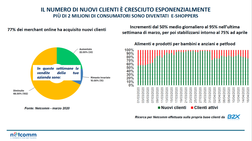 Secondo Netcomm, da inizio anno sono 2 milioni i nuovi consumatori online in Italia (in tutto 29 milioni), 1,3 milioni dei quali originati dall’emergenza sanitaria del Covid-19. Negli stessi mesi dello scorso anno (da gennaio e maggio 2019), infatti, si registravano 700.000 nuovi consumatori