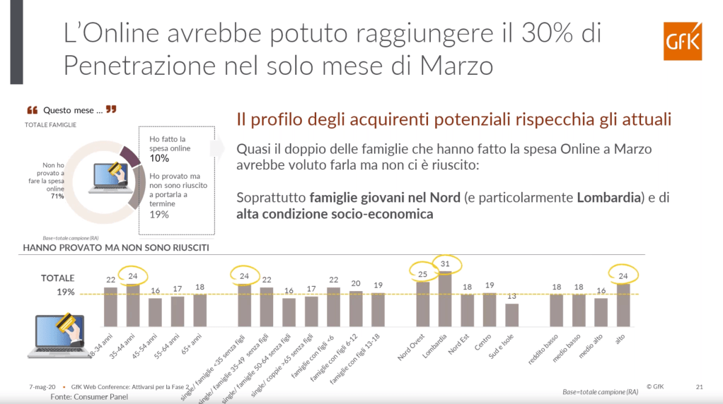GFK stima che siano state il 37% le famiglie acquirenti – nel periodo di Marzo – che hanno utilizzato il canale online e non lo avevano fatto nei 12 mesi precedenti.