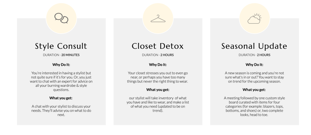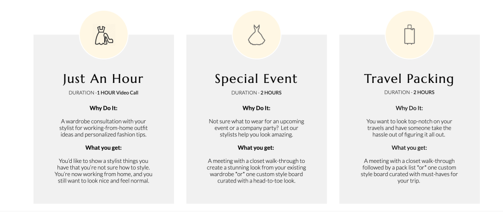 Il livestream commerce ha dato la possibilità a brand o retailer di creare eventi o collaborazione con stylist, come ad esempio il “virtual styling” di Glamhive che offre una piattaforma di servizi nelle modalità ben descritte in homepage che variano in termini di tempo e modalità ben spiegate nel “what you get”: