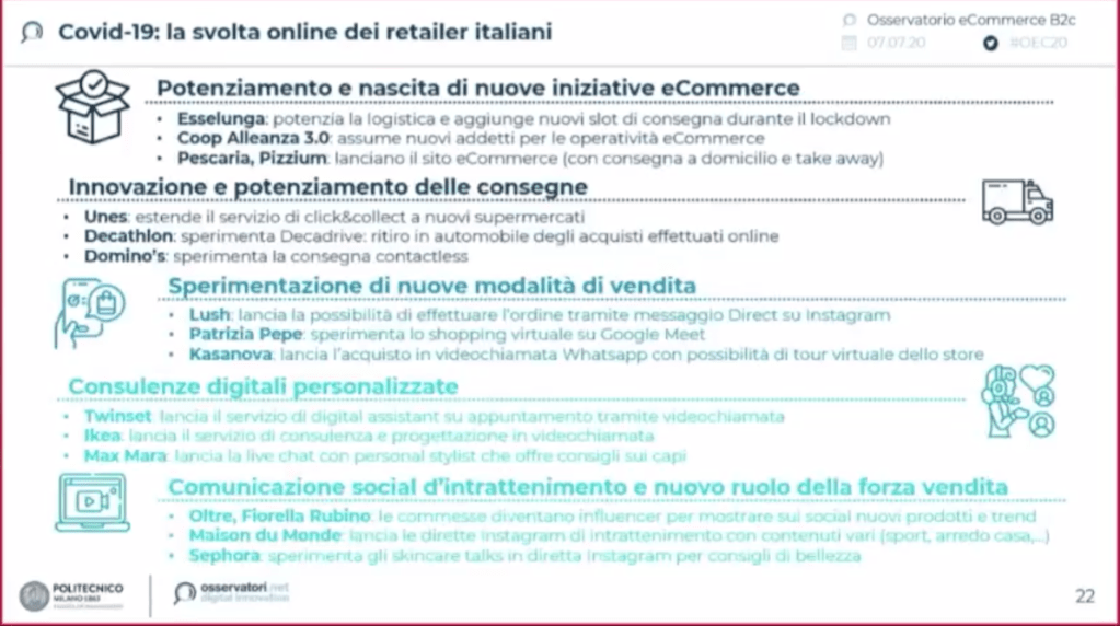 Ricapitolando alcuni esempi di servizi secondo la classificazione fornita dagli Osservatori del Politecnico di Milano: sperimentazione di nuove modalità di vendita, consulenze digitali personalizzate e comunicazione social d’intrattenimento e nuovo ruolo della forza vendita