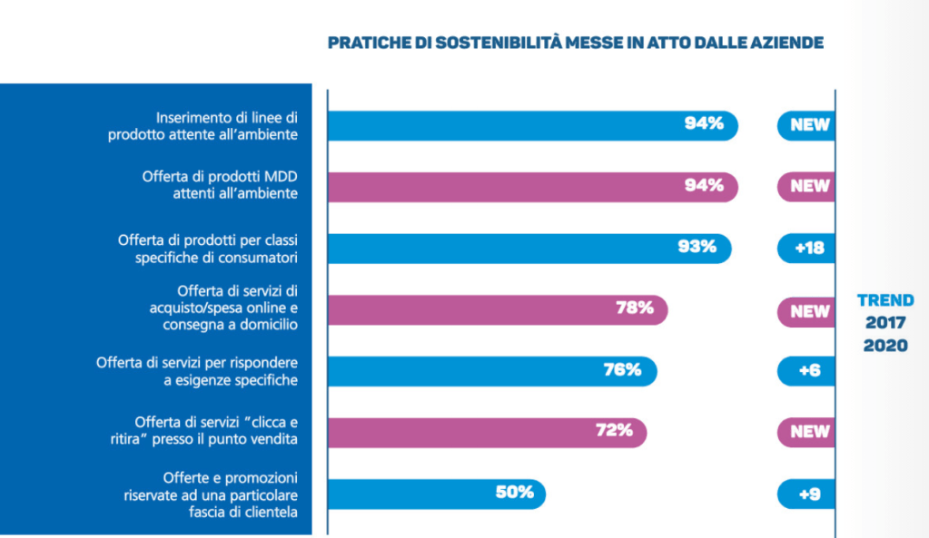- Comunicazione della sostenibilità (64%): report, selezione dedicata alla sostenibilità sul sito web, diffusione delle proprie iniziative attraverso social e forme diversificate di comunicazione verso i propri clienti