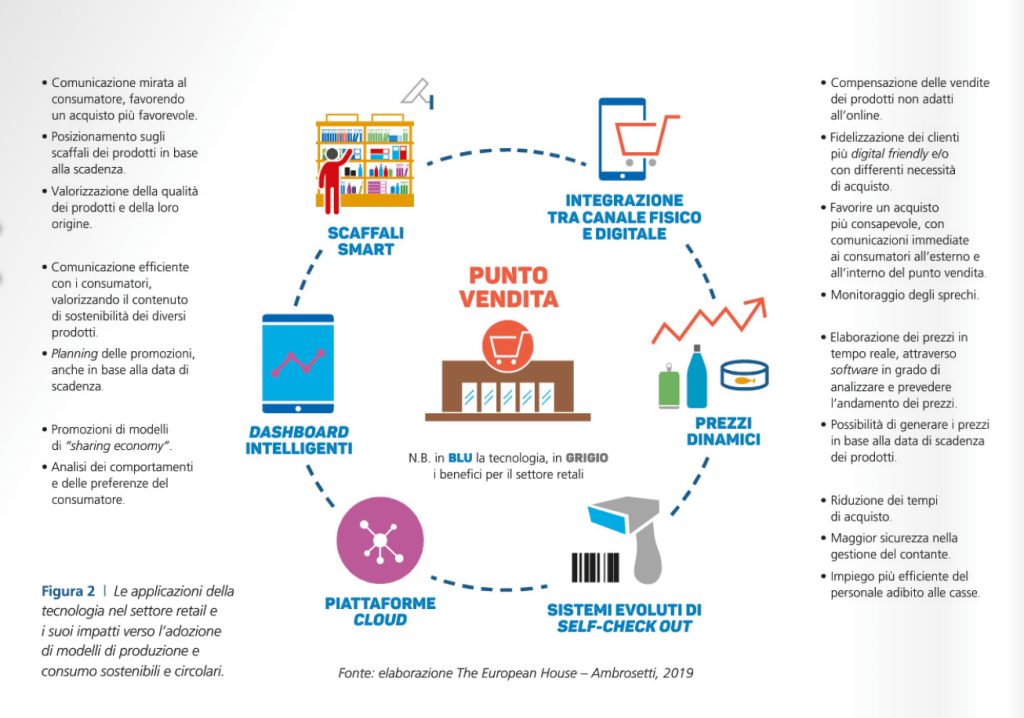 Le piattaforme di intelligenza artificiale possono essere utilizzate per l’elaborazione di prezzi in tempo reale, modificandoli in base alla data di scadenza dei prodotti con l’obiettivo di ridurre gli sprechi mentre le piattaforme cloud favoriscono la promozione di modelli sharing economy che trovano diverse applicazioni del settore di retail.