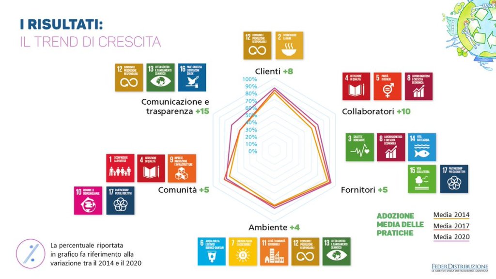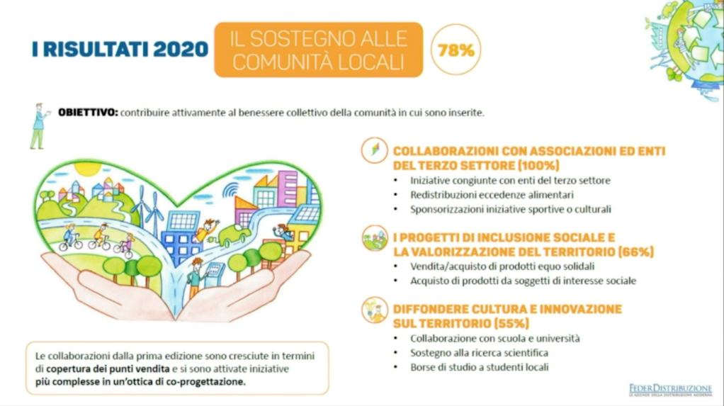 Federdistribuzione ha presentato Il bilancio di sostenibilità 2020 di settore: attraverso 103 indicatori qualitativi e quantitativi e alla luce dei 17 obiettivi per lo sviluppo sostenibile approvati dalle Nazioni Unite, rendiconta le molteplici attività delle aziende svolte fino allo scorso anno.